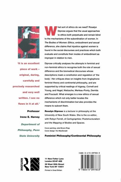 What sort of ethics do we need? Rosalyn Diprose argues that the usual approaches to ethics both perpetuate and remain blind to the mechanisms of the subordination of women. In Bodies of Women: Ethics, Embodiment and Sexual Differences, she claims that injustice against women is found in the social discourses and practices which both evaluate and constitute their modes of embodiment as improper in relation to men. Diprose critically analyses the attempts in both feminist and non-feminist ethics to recognise the role of sexual difference and the biomedical discourses whose descriptions mask a constitution and regulation of the 'body'. Her critiques draw on insights from Anglophone feminist theory and continental philosophy, and are supported by critical readings of Irigaray, Cornell and Fraser, Hegel, Nietzsche, Merleau-Ponty, Derrida and Foucault. What emerges is a new ethics of sexual difference which not only better locates the mechanisms of discrimination but also provides the means to subvert them.