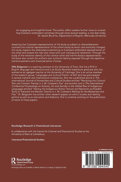 Asserting that Coetzee's representation of the body as subject to dismemberment counters the colonial representation of the other's body as exotic and erotically-charged, this study inspects the ambivalence pertaining to Coetzee's embodied representation of the other and reveals the risks that come with such contrapuntal reiteration. Through the study of the narrative identity of the colonial other and her/his body's representation, the book also unveils the author's own authorial identity exposed through the repetitive narrative patterns and characterization choices.