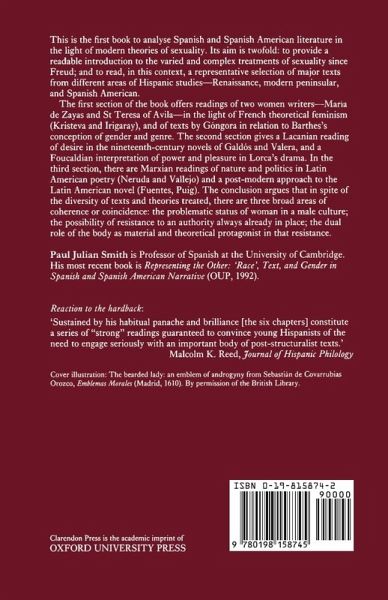 This is the first book to analyze Spanish and Spanish-American literature in light of several theories of sexuality advanced since Freud. Bringing into discussion such writers as Fuentes, Neruda, Garcia Lorca, Galdos, and St. Teresa of Avila, Smith draws on critical approaches derived from Marx, Lacan, Foucault, Barthes, and French theoretical feminism (Kristeva and Irigaray). He argues that in spite of the variety of texts and theories treated, there are three broad areas of coherence or coincidence: the status of women in a male culture; the possibility of resistance to authority; and the role of the body as protagonist in that resistance.