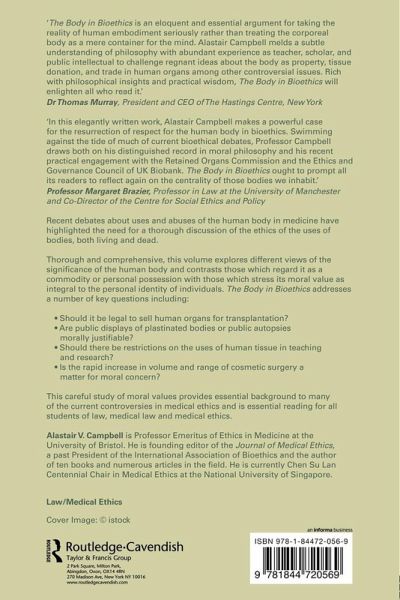 Recent debates about uses and abuses of the human body in medicine have highlighted the need for a thorough discussion of the ethics of the uses of bodies, both living and dead. Thorough and comprehensive, this volume explores different views of the significance of the human body and contrasting those which regard it as a commodity or personal possession with those which stress its moral value as integral to the personal identity of individuals. The Body in Bioethics addresses a number of key questions including: Should it be legal to sell human organs for transplantation? Are public displays of plastinated bodies or public autopsies morally justifiable? Should there be restrictions on the uses of human tissue in teaching and research? Is the rapid increase in volume and range of cosmetic surgery a matter for moral concern? This careful study of moral values provides essential background to many of the current controversies in medical ethics and is essential reading for all students of law, medical law and medical ethics.