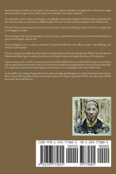 Someone dumped a body in an open grave at the cemetery, and the undertaker isn't happy about it. But he isn't happy about the police trying to solve it, either. In fact, the undertaker tries to solve it himself. The undertaker's name is Yvgeny, and Yvgeny is an unlikeable and morally ambiguous Sherlock Holmes aficionado who lives with his mother in a mortuary in middle-Georgia. He wears Victorian era dress and speaks with a Polish accent. Don't let Yvgeny's career choice scare you away from the story- while some of Yvgeny's antics will make you cringe, there is nothing gory or violent. The story begins with Yvgeny preparing for a funeral. He gets annoyed when he discovers someone dumped a body into a grave he had dug for someone else. Always looking for a way to make an extra buck, he hauls the body back to his office to inspect. After filching a nice watch, he calls the police. Of course, Yvgeny doesn't like the police, and he eventually decides to solve the crime himself. With his love for Sherlock Holmes and inflated ego, he estimates his chances of solving the crime are far higher than those of the detectives. Yvgeny teams up with a motley assortment of not always like-minded characters in this small Georgia town, trying to stay one step ahead as the detectives close in. The local talent includes the mentally deficient one-eyed owner of the army-navy surplus store and the local doctor/deputy coroner who is a recovering hippie with a Tom Selleck fetish. In the middle of everything, Yvgeny falls for the crude and vulgar granddaughter of an old man buried in his cemetery. She is turned off by his bizarre fashion and strange interests, but Yvgeny is persistent. Will he solve the crime? Will he get the girl? Read and find out!