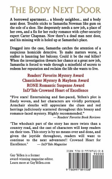 In this award-winning, heartfelt and humorous mystery, Samantha Newman is in desperate need of a new job, a place of her own, and a second chance at her rocky romance with cyber-expert Carter Chapman. Now there's a dead man next door, and his wife is holed up in the apartment where Samantha is staying. Dragged into the incriminating murder investigation, Samantha catches the attention of a suspicious homicide detective. To make matters worse, a mysterious stalker is haunting her balcony. Could it be the real killer? The investigation thwarts Samantha's chance at a new television career and instigates a fresh conflict with Carter. Sifting through conflicting theories posed by the aggressive detective, an overbearing defense attorney, and a nosy neighbor, she's confronted with more than one alarming reality. Stymied by fear and uncertainty, she begins to question the assumptions she's made about her past and her future as she navigates a minefield of secrets to redeem her reputation and reclaim the life she wants to live. A luxury high-rise condominium in the bustling city of Houston, and a ranch in the nearby HIll Country of Central Texas provide the main settings for Samantha's attempts to discover what really happened next door. Awards: Finalist, Writers League of Texas (Manuscript 2016) FIRST PLACE, 2017 Chanticleer Mystery & Mayhem