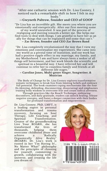 The Body of Change by Dr. Lisa Cooney explores transformative somatic techniques to break free from limiting beliefs and embrace full potential. The book examines coping mechanisms like the four Ds (denying, defending, disconnecting, dissociating) and emphasizes trusting body wisdom to overcome fear and create radical aliveness. Through practices like the Roar® Technique, embracing discomforts, and daily gratitude, readers can unlock healing, release negative energies, and foster a deeper connection with their bodies for profound transformation and empowerment. "After one cathartic session with Dr. Lisa Cooney, I noticed such a remarkable shift in how I felt in my body. I hope this book helps many more people who may be feeling disconnected to follow their path back to themselves." - Gwyneth Paltrow, founder and CEO of goop "Dr Lisa has an incredible gift. She meets you where you are emotionally and energetically. After our first meeting some of my world unraveled. It was part of the process of realigning and moving towards a better me. She helps me find tools to deal with things. I am grateful to have her as an ally for things that can be explained and some that can't." - Zac Brown, founder and CEO Zac Brown Band "Dr. Lisa completely revolutionized the way that I view my emotions and contextualize my experiences. She came into my world as a pivotal time of transition, and out work has had a positive ripple effect in my marriage, my family, and my Motherhood. I am and have always been a seeker of all things self betterment, and her work blends the scientific and spiritual in a beautiful way. I have referred her and will continue to refer her to countless family and friends at all different life stages." - Caroline Jones, Multi-genre Singer, Songwriter, & Musician