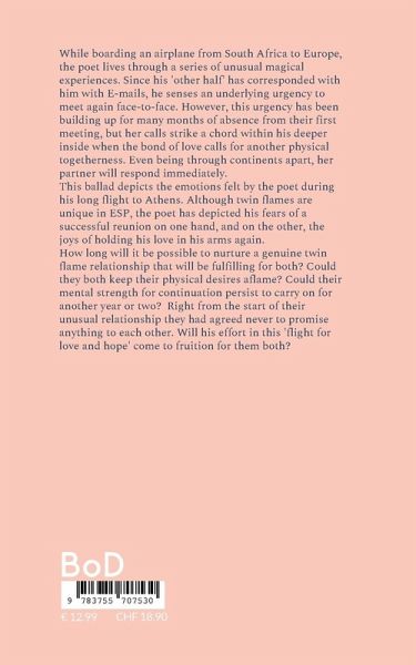 While boarding an airplane from South Africa to Europe, the poet lives through a series of unusual magical experiences. Since his 'other half' has corresponded with him with E-mails, he senses an underlying urgency to meet again face-to-face. However, this urgency has been building up for many months of absence from their first meeting, but her calls strike a chord within his deeper inside when the bond of love calls for another physical togetherness. Even being through continents apart, her partner will respond immediately.This ballad depicts the emotions felt by the poet during his long flight to Athens. Although twin flames are unique in ESP, the poet has depicted his fears of a successful reunion on one hand, and on the other, the joys of holding his love in his arms again.How long will it be possible to nurture a genuine twin flame relationship that will be fulfilling for both? Could they both keep their physical desires aflame? Could their mental strength for continuation persist to carry on for another year or two? Right from the start of their unusual relationship they had agreed never to promise anything to each other. Will his effort in this 'flight for love and hope' come to fruition for them both?
