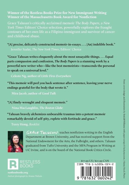 Grace Talusan is an immigrant from the Philippines. She teaches nonfiction writing in the English Department at Brown University. She has received support from United States Artists, the National Endowment for the Arts, the Brother Thomas Fund, the Fulbright, and the Massachusetts Cultural Council with residencies at Ragdale, Hedgebrook, Vermont Studio Center, Mass MOCA, and others. The Body Papers won the Restless Books Prize for New Immigrant Writing, the Massachusetts Book Award for nonfiction, was a New York Times Editors' Choice selection, and was recognized by the Boston Area Rape Crisis Center with the Beacon Award. Talusan graduated from Tufts University and the MFA Program in Writing at UC Irvine, and is on the board of the National Book Critics Circle.