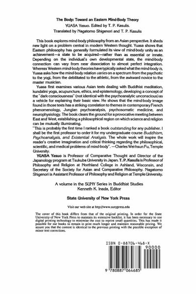 Yuasa Yasuo (1925-2005) was Professor Emeritus at Obirin University in Japan and the author of several books, including Overcoming Modernity: Synchronicity and Image-Thinking, The Body, Self-Cultivation, and Ki-Energy and The Body: Toward an Eastern Mind-Body Theory, both also published by SUNY Press.