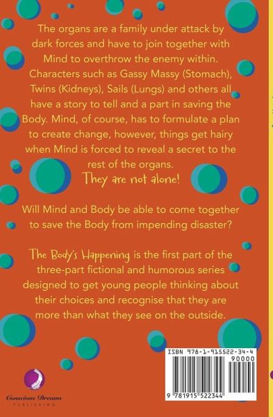 The organs are a family under attack by dark forces and have to join together with Mind to overthrow the enemy within. Characters such as Gassy Massy (Stomach), Twins (Kidneys), Sails (Lungs) and others all have a story to tell and a part in saving the Body. Mind, of course, has to formulate a plan to create change, however, things get hairy when Mind is forced to reveal a secret to the rest of the organs. They are not alone! Will Mind and Body be able to come together to save the Body from impending disaster? 'The Body's Happening' is the first part of the three-part fictional and humorous series designed to get young people thinking about their choices and recognise that they are more than what they see on the outside.