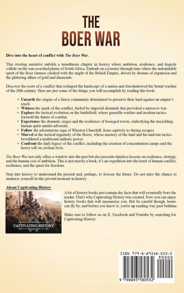 Dive into the heart of conflict with The Boer War. This riveting narrative unfolds a tumultuous chapter in history where ambition, resilience, and tragedy collide on the sun-scorched plains of South Africa. Embark on a journey through time where the indomitable spirit of the Boer farmers clashed with the might of the British Empire, driven by dreams of expansion and the glittering allure of gold and diamonds. Discover the roots of a conflict that reshaped the landscape of a nation and foreshadowed the brutal warfare of the 20th century. Here are just some of the things you will accomplish by reading this book: ¿¿¿¿ Unearth the origins of a fierce community determined to preserve their land against an empire's reach. ¿¿¿¿ Witness the spark of the conflict, fueled by imperial demands that provoked a nation to war. ¿¿ Explore the tactical evolution on the battlefield, where guerrilla warfare and modern tactics foretold the future of combat. ¿¿¿¿ Experience the dramatic sieges and the resilience of besieged towns, embodying the unyielding human spirit amidst adversity. ¿ Follow the adventurous saga of Winston Churchill, from captivity to daring escapes. ¿¿¿¿¿ Marvel at the tactical ingenuity of the Boers, whose mastery of the land and hit-and-run tactics bewildered a traditional military power. ¿¿¿¿ Confront the dark legacy of the conflict, including the creation of concentration camps and the heavy toll on civilian lives. The Boer War not only offers a window into the past but also presents timeless lessons on resilience, strategy, and the human cost of ambition. This is not merely a book; it's an expedition into the heart of human conflict, resilience, and the quest for freedom.
