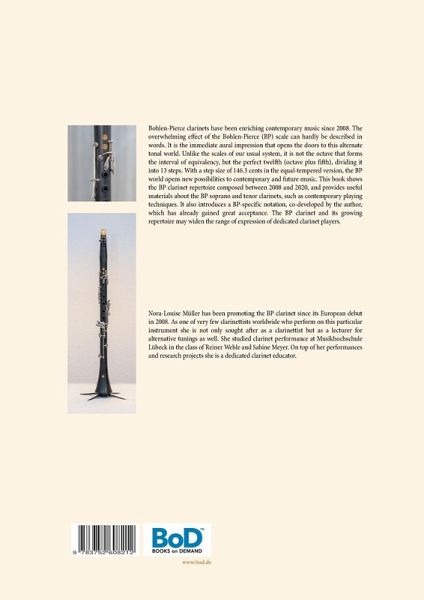 Abstract Repertoire in Bohlen-Pierce (BP) tuning has grown significantly since the debut of BP clarinets in 2008. Literature specifically dedicated to the BP clarinet, on the other hand, is still rare. Practice-led research conducted by the author provides useful materials about the BP soprano and tenor clarinets, such as contemporary playing techniques or acoustical conditions. The current state of repertoire is shown; exemplary analyses of compositions featuring one or more BP clarinets are given. A new BP specific notation is introduced; it has been developed from a practical point of view and has gained great acceptance among musicians performing in BP. Beside using BP as the (only) tuning system in compositions, it is also possible to combine BP with other scales to achieve effects of extended tonalities or rich microtonal structures. Multiphonics as a very popular phenomenon in contemporary woodwind music are highlighted, providing fingering charts and notational suggestions for both BP soprano and BP tenor clarinets. The theoretical idea of a BP third-tone scale (39div3) is transferred into practice by providing fingering charts and practical advice to performers and composers. I hope that this thesis can give inspiration and advice to those motivated to compose for and perform on BP clarinets, and that BP clarinets will gain the popularity they deserve in contemporary music performance. The BP clarinet and its growing repertoire may widen the range of expression of dedicated clarinet players.