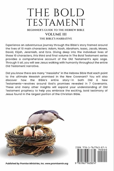 Experience an adventurous journey through the Bible's story framed around the lives of 10 main characters: Adam, Noah, Abraham, Isaac, Jacob, Moses, David, Elijah, Jeremiah, and Ezra. Diving deep into the individual lives of these 10 characters, this third and final volume in The Bold Testament series provides a comprehensive account of the Old Testament's epic saga. Through it all, you will see Jesus walking with humanity throughout the entire Old Testament narrative. Did you know there are many "messiahs" in the Hebrew Bible that each point to the ultimate Messiah promised in the New Covenant? You will also discover how the Bible's entire story-in both Old & New Testaments-revolves around God's promises revealed in 7 Covenants. These and many other insights will expand your understanding of Old Testament prophecy to help you embrace the exciting, bold testimony of Jesus found in the largest portion of the Christian Bible.