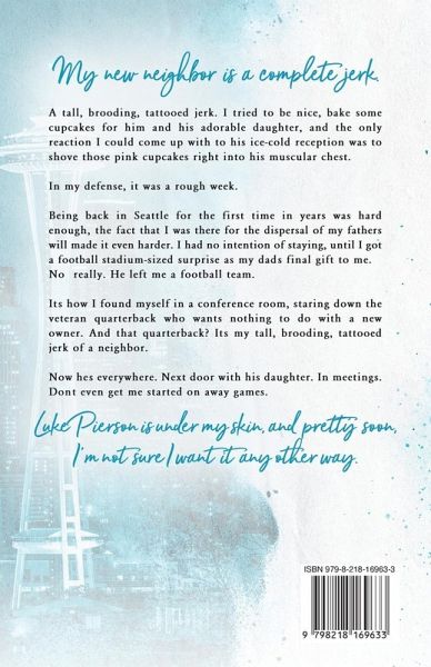 My new neighbor is a complete jerk. A tall, brooding, tattooed jerk. I tried to be nice, bake some cupcakes for him and his adorable daughter, and the only reaction I could come up with to his ice-cold reception was to shove those pink cupcakes right into his muscular chest. In my defense, it was a rough week. Being back in Seattle for the first time in years was hard enough, the fact that I was there for the dispersal of my father's will made it even harder. I had no intention of staying, until I got a football stadium-sized surprise as my dad's final gift to me. No ... really. He left me a football team. It's how I found myself in a conference room, staring down the veteran quarterback who wants nothing to do with a new owner. And that quarterback? It's my tall, brooding, tattooed jerk of a neighbor. Now he's everywhere. Next door with his daughter. In meetings. Don't even get me started on away games. Luke Pierson is under my skin, and pretty soon, I'm not sure I want it any other way.