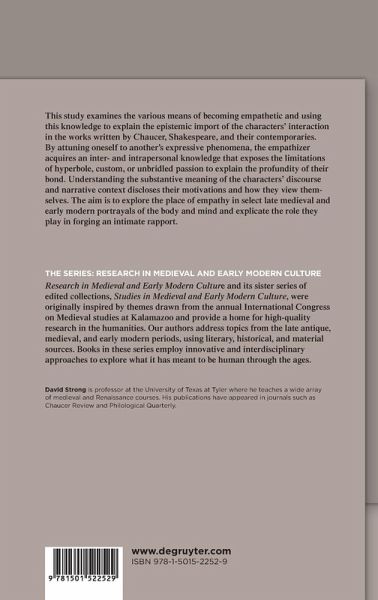 This study examines the various means of becoming empathetic and using this knowledge to explain the epistemic import of the characters' interaction in the works written by Chaucer, Shakespeare, and their contemporaries. By attuning oneself to another's expressive phenomena, the empathizer acquires an inter- and intrapersonal knowledge that exposes the limitations of hyperbole, custom, or unbridled passion to explain the profundity of their bond. Understanding the substantive meaning of the characters' discourse and narrative context discloses their motivations and how they view themselves. The aim is to explore the place of empathy in select late medieval and early modern portrayals of the body and mind and explicate the role they play in forging an intimate rapport.
