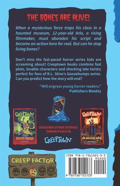 Indiana Jones meets Goosebumps in this chilling Creeptown adventure! When a mysterious force traps his class in a haunted museum, 12-year-old Arlo, a rising filmmaker, must abandon his script and become an action hero for real. But can he stop living bones? Don't miss the fast-paced horror series kids are screaming about! Creeptown books combine fast plots, lovable characters and shocking late twists. Perfect for fans of R.L. Stine's Goosebumps. Can you predict how the story will end?