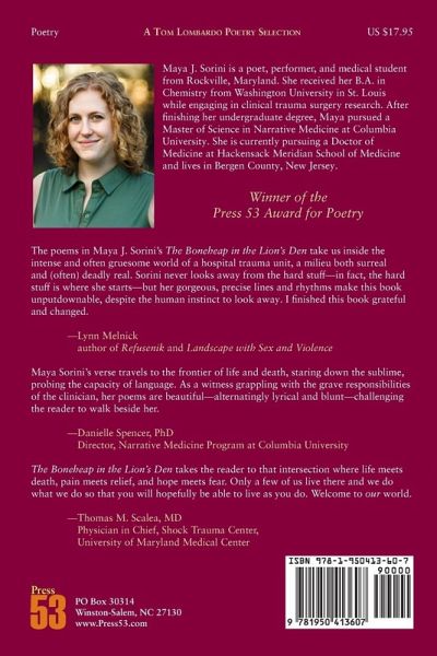 The poems in Maya J. Sorini's The Boneheap in the Lion's Den take us inside the intense and often gruesome world of a hospital trauma unit, a milieu both surreal and (often) deadly real. Sorini never looks away from the hard stuff-in fact, the hard stuff is where she starts-but her gorgeous, precise lines and rhythms make this book unputdownable, despite the human instinct to look away. I finished this book grateful and changed. -Lynn Melnick
