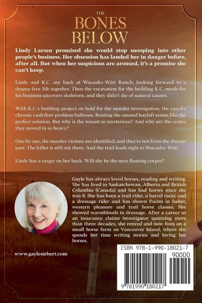 Lindy Larsen promised K.C. she would stop snooping into other people's business. Her obsession has landed her in danger before, after all. But when her suspicions are aroused, it's a promise she can't keep. Lindy and K.C. are back at Wacasko-Wâti Ranch, looking forward to a drama-free life together. Then the excavation for the building K.C. needs for his business uncovers skeletons, and they didn't die of natural causes. With K.C.'s building project on hold for the murder investigation, the ranch's chronic cash flow problem balloons. Renting the unused hayloft seems like the perfect solution. But why is the tenant so mysterious? And why are the crates they moved in so heavy? One by one, the murder victims are identified, and they're not from the distant past. The killer is still out there. And the trail leads right to Wacasko-Wâti.