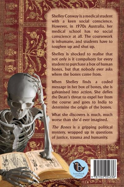 Shelley Conway is a medical student with a keen social conscience. However, in 1970s Australia, her medical school has no social conscience at all. The coursework is inhumane, and students have to toughen up and shut up. Shelley is shocked to realise that not only is it compulsory for every student to purchase a box of human bones, but that nobody ever asks where the bones come from. When Shelley finds a coded message in her box of bones, she is galvanised into action. She defies the Dean's threat to expel her from the course and goes to India to determine the origin of the bones. What she discovers is much, much worse than she'd ever imagined. The Bones is a gripping political mystery, wrapped up in questions of justice, trauma and humanity.