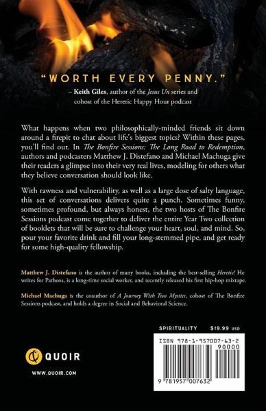 What happens when two philosophically-minded friends sit down around a firepit to chat about life's biggest topics? Within these pages, you'll find out. In The Bonfire Sessions: The Long Road to Redemption, authors and podcasters Matthew J. Distefano and Michael Machuga give their readers a glimpse into their very real lives, modeling for others what they believe conversation should look like. With rawness and vulnerability, as well as a large dose of salty language, this set of conversations delivers quite a punch. Sometimes funny, sometimes profound, but always honest, the two hosts of The Bonfire Sessions podcast come together to deliver the entire Year Two collection of booklets that will be sure to challenge your heart, soul, and mind. So, pour your favorite drink and fill your long-stemmed pipe, and get ready for some high-quality fellowship.