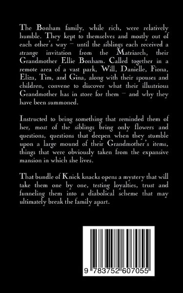 The Bonham family, while rich, were relatively humble. They kept to themselves and mostly out of each other's way - until the siblings each received a strange invitation from the Matriarch, their Grandmother Ellie Bonham. Called together in a remote area of a vast park, Will, Danielle, Fiona, Eliza, Tim, and Gina, along with their spouses and children, convene to discover what their illustrious Grandmother has in store for them - and why they have been summoned.Instructed to bring something that reminded them of her, most of the siblings bring only flowers and questions, questions that deepen when they stumble upon a large mound of their Grandmother's items, things that were obviously taken from the expansive mansion in which she lives.That bundle of Knick knacks opens a mystery that will take them one by one, testing loyalties, trust and funneling them into a diabolical scheme that may ultimately break the family apart.