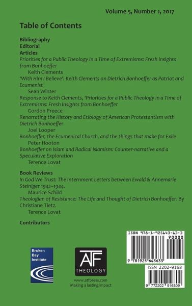 An International Journal is a fully refereed academic journal aimed principally at providing an outlet for an ever expanding Bonhoeffer scholarship in Australia, New Zealand and the South Pacific region, as well as being open to article submissions from Bonhoeffer scholars throughout the world. It also aims to elicit and encourage future and ongoing scholarship in the field. The focus of the journal, captured in the notion of ‘Legacy’, is on any aspect of Bonhoeffer’s life, theology and political action that is relevant to his immense contribution to twentieth century events and scholarship. ‘Legacy’ can be understood as including those events and ideas that contributed to Bonhoeffer’s own development, those that constituted his own context or those that have developed since his time as a result of his work. The editors encourage and welcome any scholarship that contributes to the journal’s aims. The journal also has book reviews.