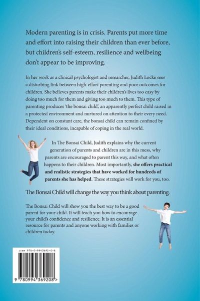 Modern parenting is in crisis. Parents put more time and effort into raising their children than ever before, but children's self-esteem, resilience and wellbeing don't appear to be improving. In her work as a clinical psychologist and researcher, Judith Locke, PhD sees a disturbing link between high-effort parenting and poor outcomes for children. She believes parents make their children's lives too easy by doing too much for them and giving too much to them. This type of parenting produces 'the bonsai child', an apparently perfect child raised in a protected environment and nurtured on attention to their every need. Dependent on constant care, the bonsai child can remain confined by their ideal conditions, incapable of coping in the real world. In The Bonsai Child, Judith explains why the current generation of parents and children are in this mess, why parents are encouraged to parent this way, and what often happens to their children. Most importantly, she offers practical and realistic strategies that have worked for hundreds of parents she has helped. These strategies will work for you, too. The Bonsai Child will change the way you think about parenting. This book will show you the best way to be a good parent for your child. It will teach you how to encourage your child's confidence and resilience. It is an essential resource for parents and anyone working with families or children today.