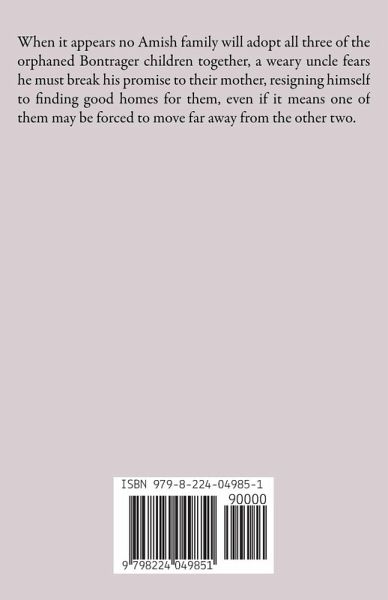 When it appears no Amish family will adopt all three of the orphaned Bontrager children together, a weary uncle fears he must break his promise to their mother, resigning himself to finding good homes for them, even if it means one of them may be forced to move far away from the other two.