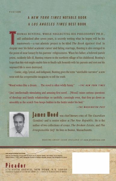 Thomas Bunting while neglecting his philosophy Ph.D., still unfinished after seven years, is secretly writing what he hopes will be his masterwork--a vast atheistic project to be titled The Book Against God. In despair over his failed academic career and failing marriage, Bunting is also enraged to the point of near lunacy by his parents' religiousness. When his father, a beloved parish priest, suddenly falls ill, Bunting returns to the Northern village of his childhood. Bunting's hopes that this visit might enable him to finally talk honestly with his parents and sort out his wayward life, are soon destroyed. Comic, edgy, lyrical, and indignant Bunting gives the term unreliable narrator a new twist with his irrepressible incapacity to tell the truth.