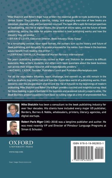 Many of us read books every day, either electronically or in print. We remember the books that shaped our ideas about the world as children, go back to favorite books year after year, give or lend books to loved ones and friends to share the stories we've loved especially, and discuss important books with fellow readers in book clubs and online communities. But for all the ways books influence us, teach us, challenge us, and connect us, many of us remain in the dark as to where they come from and how the mysterious world of publishing truly works. How are books created and how do they get to readers? The Book Business: What Everyone Needs to Know® introduces those outside the industry to the world of book publishing. Covering everything from the beginnings of modern book publishing early in the 20th century to the current concerns over the alleged death of print, digital reading, and the rise of Amazon, Mike Shatzkin and Robert Paris Riger provide a succinct and insightful survey of the industry in an easy-to-read question-and-answer format. The authors, veterans of "trade publishing," or the branch of the business that puts books in our hands through libraries or bookstores, answer questions from the basic to the cutting-edge, providing a guide for curious beginners and outsiders. How does book publishing actually work? What challenges is it facing today? How have social media changed the game of book marketing? What does the life cycle of a book look like in 2019? They focus on how practices are changing at a time of great flux in the industry, as digital creation and delivery are altering the commercial realities of the book business. This book will interest not only those with no experience in publishing looking to gain a foothold on the business, but also those working on the inside who crave a bird's eye view of publishing's evolving landscape. This is a moment of dizzyingly rapid change wrought by the emergence of digital publishing, data collection, e-books, audio books, and the rise of self-publishing; these forces make the inherently interesting business of publishing books all the more fascinating.