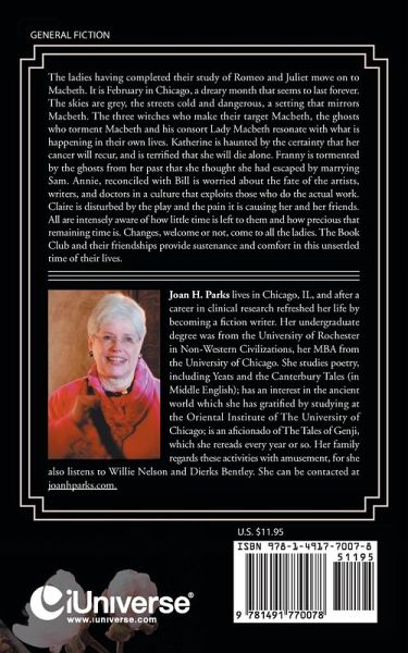 The ladies having completed their study of Romeo and Juliet move on to Macbeth. It is February in Chicago, a dreary month that seems to last forever. The skies are grey, the streets cold and dangerous, a setting that mirrors Macbeth. The three witches who make their target Macbeth, the ghosts who torment Macbeth and his consort Lady Macbeth resonate with what is happening in their own lives. Katherine is haunted by the certainty that her cancer will recur, and is terrified that she will die alone. Franny is tormented by the ghosts from her past that she thought she had escaped by marrying Sam. Annie, reconciled with Bill is worried about the fate of the artists, writers, and doctors in a culture that exploits those who do the actual work. Claire is disturbed by the play and the pain it is causing her and her friends. All are intensely aware of how little time is left to them and how precious that remaining time is. Changes, welcome or not, come to all the ladies. The Book Club and their friendships provide sustenance and comfort in this unsettled time of their lives.