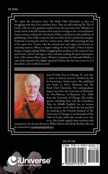 We rejoin the characters from The Book Club Chronicles as they are struggling with their lives and their loves. They are still studying The Tale of Genji, with the same graduate student from that previous time. Bill plots to return Annie to his life because of his need for revenge or for a reconciliation? Annie resumes writing after the death of Hans, and discovers the problems of publishing. Claire flails around to find an outlet for her intellectual energies. Katherine is having fun with her various men, while still mourning the loss of her great love. Franny, who has turned sour and angry, has become an annoying mystery. What is a happy ending for these ladies, if there is such a thing as a happy ending? While struggling they meditate on the nature of men and women and of marriages as they continue reading the great masterpiece from 12th century Heian Japan. Written in Japanese by Murasaki Shikibu, a court lady, instead of the highly regarded Chinese that the men wrote in, it is described as the worlds first novel.