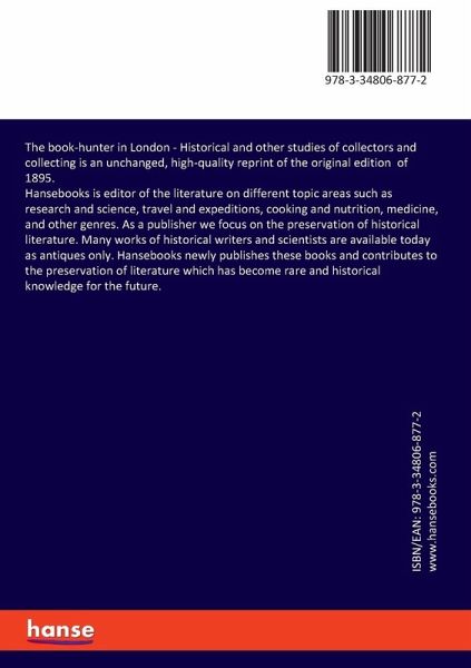 The book-hunter in London - Historical and other studies of collectors and collecting is an unchanged, high-quality reprint of the original edition of 1895.Hansebooks is editor of the literature on different topic areas such as research and science, travel and expeditions, cooking and nutrition, medicine, and other genres. As a publisher we focus on the preservation of historical literature. Many works of historical writers and scientists are available today as antiques only. Hansebooks newly publishes these books and contributes to the preservation of literature which has become rare and historical knowledge for the future.