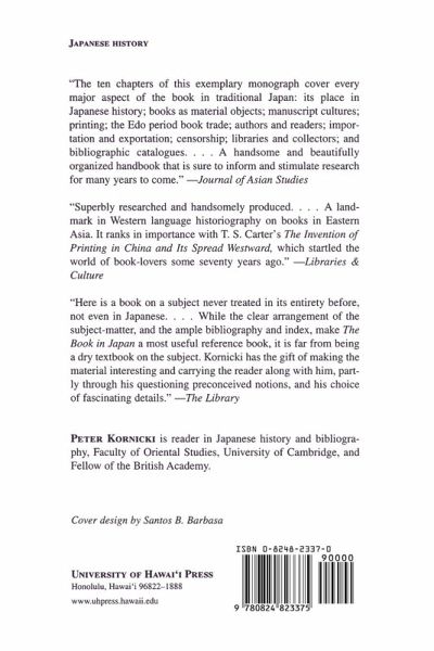 The ten chapters of this exemplary monograph cover every major aspect of the book in traditional Japan: its place in Japanese history; books as material objects; manuscript cultures; printing; the Edo period book trade; authors and readers; importation and exportation; censorship; libraries and collectors; and bibliographic catalogues.... A handsome and beautifully organized handbook that is sure to inform and stimulate research for many years to come.