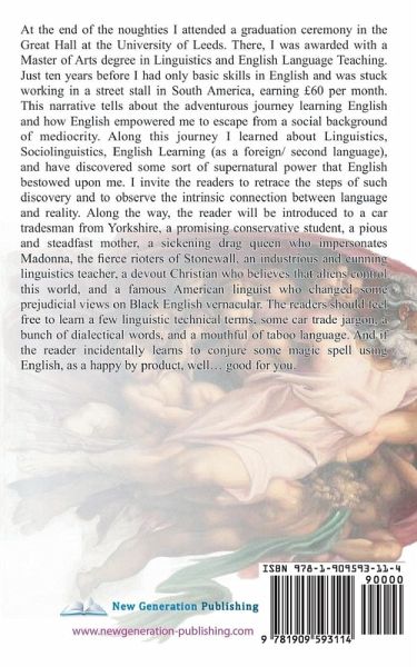 At the end of the noughties I attended a graduation ceremony in the Great Hall at the University of Leeds. There, I was awarded with a Master of Arts degree in Linguistics and English Language Teaching. Just ten years before I had only basic skills in English and was stuck working in a street stall in South America, earning £60 per month. This narrative tells about the adventurous journey learning English and how English empowered me to escape from a social background of mediocrity. Along this journey I learned about Linguistics, Sociolinguistics, English Learning (as a foreign/ second language), and have discovered some sort of supernatural power that English bestowed upon me. I invite the readers to retrace the steps of such discovery and to observe the intrinsic connection between language and reality. Along the way, the reader will be introduced to a car tradesman from Yorkshire, a promising conservative student, a pious and steadfast mother, a sickening drag queen who impersonates Madonna, the fierce rioters of Stonewall, an industrious and cunning linguistics teacher, a devout Christian who believes that aliens control this world, and a famous American linguist who changed some prejudicial views on Black English vernacular. The readers should feel free to learn a few linguistic technical terms, some car trade jargon, a bunch of dialectical words, and a mouthful of taboo language. And if the reader incidentally learns to conjure some magic spell using English, as a happy by product, well... good for you.