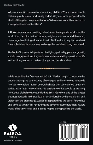 Why are some kids born with extraordinary abilities? Why are some people lesbian, gay, bisexual, and transgender? Why are some people deadly afraid of things for no apparent reason? Why are we instantly attracted to some people and not to others? J. R. Wexler creates an exciting tale of seven teenagers from all over the world that, despite their economic, religious, and cultural differences, come together during a lunar eclipse in 2017 and not only become best friends, but also discover a way to change the world and bring peace to all. The Book of 7 spans a full spectrum of religion, spirituality, personal growth, social change, relationships, and more, while unraveling questions of life and inspiring readers to make a change, both inside and out.