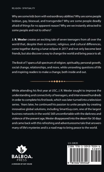 Why are some kids born with extraordinary abilities? Why are some people lesbian, gay, bisexual, and transgender? Why are some people deadly afraid of things for no apparent reason? Why are we instantly attracted to some people and not to others? J. R. Wexler creates an exciting tale of seven teenagers from all over the world that, despite their economic, religious, and cultural differences, come together during a lunar eclipse in 2017 and not only become best friends, but also discover a way to change the world and bring peace to all. The Book of 7 spans a full spectrum of religion, spirituality, personal growth, social change, relationships, and more, while unraveling questions of life and inspiring readers to make a change, both inside and out.