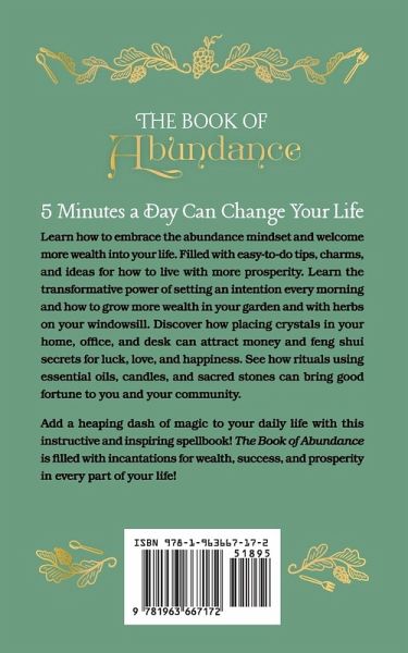 Discover How 5 Minutes a Day Can Change Your Life Are money worries keeping you up at night? Are your savings and 401k shrinking while you're working harder than ever? Are you experiencing sticker shock everytime you buy groceries? If these or any of other financial woes are adding undue stress to your life, The Book of Abundance is filled with inspired ideas that will bring back your prosperity and ease your mind. Learn how to embrace the abundance mindset and welcome more wealth into your life. Filled with easy-to-do tips, charms and ideas for how you can live with more prosperity. Learn the transformative power of setting an intention every morning and how you can literally grow more wealth in your garden and with herbs in your windowsill. Discover how placing crystals in your home, office and desk can attract money and feng shui secrets for luck, love and happiness. See how rituals using essential oils, candles and sacred stone can bring good fortune to you and your family so you can enjoy the life you already dreamed, overflowing with comfort and joy. It is much easier than you think to attain wealth, security and personal prosperity with the wisdom in The Book of Abundance. Add a heaping dash of magic to your daily life with this instructive and inspiring spellbook filled with incantations for wealth, success, and prosperity. Easy Tips and Tricks Inside this book: Learn why the cinnamon sticks in your cupboard are budget boosters. Discover where the *wealth corner* is in your home and how you can maximize it. Find which crystals are lucky for you in your home and workspace. Create an easy-peasy DIY fountain to increase your money flow and much more!