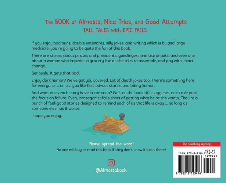 A delightfully illustrated, satirical book of VERY short stories and tall tales-most of which are humorous-all of which were meant to be funny. Perfect for a coffee table, or to balance a chair with a short leg! Not ideal for children. If you were searching for a quirky book by a first-time author, of no acclaim, who was probably drunk 30-35% of the time he insisted he was writing, then this could be the perfect purchase for you! Or ... and hear me out on this ... it's also possible that this book could be a total waste of your time and money.And that speaks to a simple truth. Sometimes, life works out for us. Sometimes, it doesn't.Of course, if you're the protagonist in any of the stories in this book, always assume it will be the latter.The Book of Almosts, Nice Tries, and Good Attempts is a series of illustrated tales, for adult readers, who take great pleasure in seeing others fail. The second fastest gun in the West meets the guy who is quicker on the draw. The woman who claimed to have exact change fails to find a single penny. Even the guy who tries to build a better ark than Noah ends up treading water. It's a book where no one wins, except you, the reader ... because you wisely decided to buy it.Or maybe you didn't. What do I know? I'm just a guy who's about to step out to get another drink.By the way ... This book could be a great gift idea for that friend of yours with the fantastic sense of humor. They'd definitely appreciate it. Just saying.WARNING: Please be advised that this book contains a few foul words and humor more suited to adults than children. It also contains way, way, way, way too much redundancy.NOTE ON PRICING: The retail prices for this book aren't cheap. I get it. Please know that as the author/publisher, I am slated to earn under $2.00 USD on any retail sale of the paperback and under $3.00 USD on the hardcover (in the U.S.). It's a modest amount. My simple goal was to write something that would spark a smile, with the help of a phenomenally talented illustrator, and for at least the hardcover edit to be worthy of a place on your coffee table. To do that, and to not lose money in the process, this is the pricing I am able to provide. Thank you for understanding.Follow me on Instragram: @Almostabook