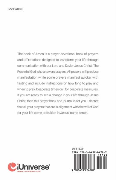 The book of Amen is a prayer devotional book of prayers and affirmations designed to transform your life through communication with our Lord and Savior Jesus Christ. The Powerful God who answers prayers. All prayers will produce manifestation while some prayers manifest quicker with fasting and include instructions on how long to pray and when to pray. Desperate times call for desperate measures. If you are ready to see a change in your life through Jesus Christ, then this prayer book and journal is for you. I decree that all your prayers that are in alignment with the will of God for your life come to fruition in Jesus' name Amen.