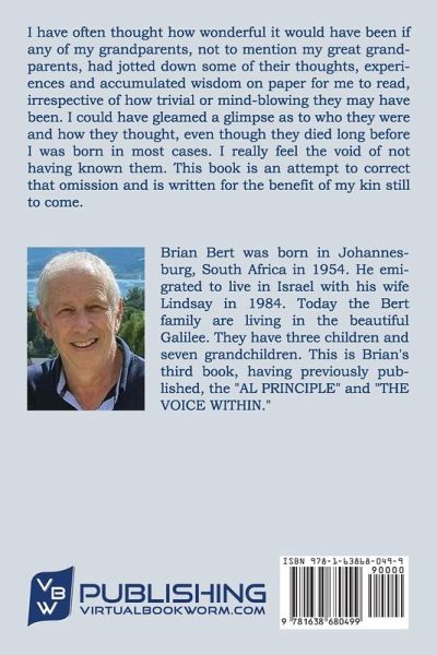 I have often thought how wonderful it would have been if any of my grandparents, not to mention my great grandparents, had jotted down some of their thoughts, experiences and accumulated wisdom on paper for me to read, irrespective of how trivial or mind-blowing they may have been. I could have gleamed a glimpse as to who they were and how they thought, even though they died long before I was born in most cases. I really feel the void of not having known them. This book is an attempt to correct that omission and is written for the benefit of my kin still to come.