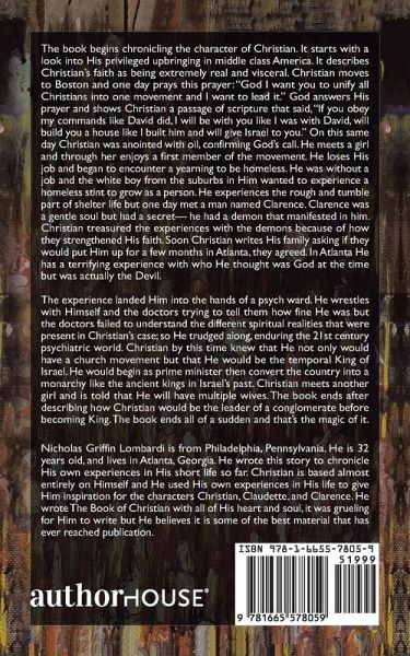 The book begins chronicling the character of Christian. It starts with a look into His privileged upbringing in middle class America. It describes Christian's faith as being extremely real and visceral. Christian moves to Boston and one day prays this prayer: "God I want you to unify all Christians into one movement and I want to lead it." God answers His prayer and shows Christian a passage of scripture that said, "If you obey my commands like David did, I will be with you like I was with David, will build you a house like I built him and will give Israel to you." On this same day Christian was anointed with oil, confirming God's call. He meets a girl and through her enjoys a first member of the movement. He loses His job and began to encounter a yearning to be homeless. He was without a job and the white boy from the suburbs in Him wanted to experience a homeless stint to grow as a person. He experiences the rough and tumble part of shelter life but one day met a man named Clarence. Clarence was a gentle soul but had a secret- he had a demon that manifested in him. Christian treasured the experiences with the demons because of how they strengthened His faith. Soon Christian writes His family asking if they would put Him up for a few months in Atlanta, they agreed. In Atlanta He has a terrifying experience with who He thought was God at the time but was actually the Devil. The experience landed Him into the hands of a psych ward. He wrestles with Himself and the doctors trying to tell them how fine He was but the doctors failed to understand the different spiritual realities that were present in Christian's case; so He trudged along, enduring the 21st century psychiatric world. Christian by this time knew that He not only would have a church movement but that He would be the temporal King of Israel. He would begin as prime minister then convert the country into a monarchy like the ancient kings in Israel's past. Christian meets another girl and is told that He will have multiple wives. The book ends after describing how Christian would be the leader of a conglomerate before becoming King. The book ends all of a sudden and that's the magic of it.