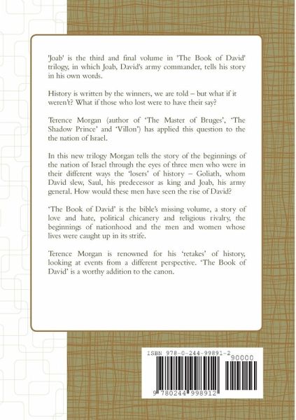 'Joab' is the third and final volume in 'The Book of David' trilogy. History is written by the winners, we are told - but what if it weren't? What if those who lost were to have their say? Terence Morgan (author of 'The Master of Bruges', 'The Shadow Prince' and 'Villon') has applied this question to the nation of Israel. Morgan tells the story of the beginnings of Israel through the eyes of three men who were in their different ways the 'losers' of history - Goliath, whom David slew, Saul, his predecessor as king and Joab, his army general. How would these men have seen the rise of David? 'The Book of David' is the bible's missing volume, a story of love and hate, political chicanery and religious rivalry, the beginnings of nationhood and the men and women whose lives were caught up in its strife. Terence Morgan is renowned for his 'retakes' of history, looking at events from a different perspective. 'The Book of David' is a worthy addition to the canon.