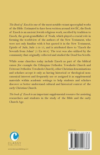 The Book of Enoch is one of the most notable extant apocryphal works of the Bible. Estimated to have been written around 300 BC, the Book of Enoch is an ancient Jewish religious work, ascribed by tradition to Enoch, the great-grandfather of Noah, which played a crucial role in forming the worldview of the authors of the New Testament, who were not only familiar with it but quoted it in the New Testament, Epistle of Jude, Jude 1:14 15, and is attributed there to "Enoch the Seventh from Adam" (1 En 60:8). The text was also utilized by the community that originally collected and studied the Dead Sea Scrolls. While some churches today include Enoch as part of the biblical canon (for example the Ethiopian Orthodox Tewahedo Church and Eritrean Orthodox Tewahedo Church), other Christian denominations and scholars accept it only as having historical or theological non-canonical interest and frequently use or assigned it as supplemental materials within academic settings to help students and scholars discover or better understand cultural and historical context of the early Christian Church. The book of Enoch is an important supplemental resource for assisting researchers and students in the study of the Bible and the early Church Age.