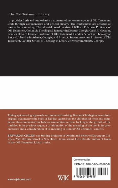 Taking a pioneering approach to commentary writing, Brevard Childs gives an entirely original treatment to the book of Exodus. Apart from the philological notes and translation, this commentary includes a form-critical section, looking at the growth of the tradition in its previous stages; a consideration of the meaning of the text in its present form; and a consideration of its meaning in its total Old Testament context. This volume is now available in a new casebound edition.