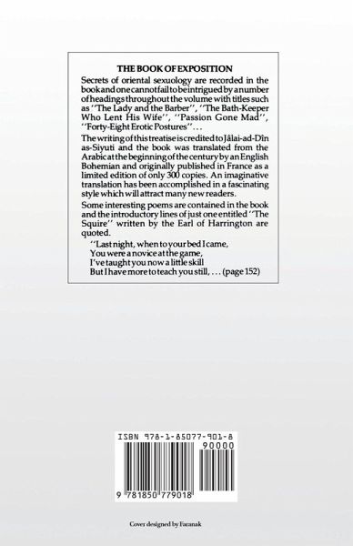 Kitab al-izah fi'ilm al-nikah b-it-tamam w-al-kamal : literally translated from the Arabic, with translator's foreword, numerous important notes illustrating the text, and several interesting appendices / by an English bohemian. The writing of this treatise is credit to Jalal Addin Al-Siyuti and the book was translated from the Arabic at the beginning of the century by an English Bohemian. It was originally published in France as a limited edition of only 300 copies. An imaginative translation has been accomplished in a fascinating style, attempting to mimic Arabic rhythmic prose.
