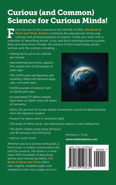Entertaining, informative, and enlightening! Educational, eyebrow-raising, and profound. Science has never been this much fun! Take a weird and wonderful tour of the every branch of science with this treat of stories, trivia, and facts! From Earth's weight gain thanks to the many tons of cosmic dust that falls on the planet each year to William A. Mitchell, the inventor of Tang, Cool Whip, and Pop Rocks candy, The Book of Facts and Trivia: Science combines the educational, profound, and trivial into a fascinating collection of science facts! You’ll learn about yourself and the world through hundreds of absorbing stories and interesting tidbits such as … Kissing burns up to six calories per minute. One teaspoon of neuron star weighs about 10 million tons. There are more than 2 million ants for every single person on Earth. That’s approximately 20 quadrillion ants! Neanderthals and Homo sapiens first mated tens of thousands of years ago. Under the right conditions, some dogs - the super-scenters – can smell you some 12 miles away. Nine out of 10 mothers of newborns, after having spent as little as 10 minutes with their babies, can identify their infant by smell. The body of Marie Curie (1867-1934), the physicist who discovered radium, is still radioactive. The first multiplication tables were used around 2000 B.C.E. by the Babylonians. Star Trek characters used devices that looked and acted quite a bit like cell phones-well before the technology came to market. Touchscreen computers too. And many more science facts! An absorbing guide to science answers, The Book of Facts and Trivia will treat you to a smorgasbord of stories, trivia, and facts!