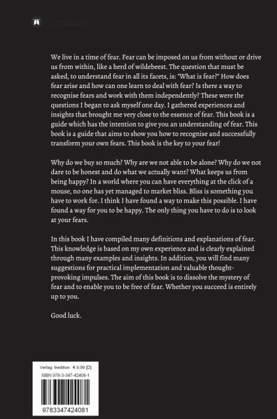We live in a time of fear. Fear can be imposed on us from without or drive us from within, like a herd of wildebeest. The question that must be asked, to understand fear in all its facets, is: "What is fear?" How does fear arise and how can one learn to deal with fear? Is there a way to recognise fears and work with them independently? These were the questions I began to ask myself one day. I gathered experiences and insights that brought me very close to the essence of fear. This book is a guide which has the intention to give you an understanding of fear. This book is a guide that aims to show you how to recognise and successfully transform your own fears. This book is the key to your fear! Why do we buy so much? Why are we not able to be alone? Why do we not dare to be honest and do what we actually want? What keeps us from being happy? In a world where you can have everything at the click of a mouse, no one has yet managed to market bliss. Bliss is something you have to work for. I think I have found a way to make this possible. I have found a way for you to be happy. The only thing you have to do is to look at your fears. In this book I have compiled many definitions and explanations of fear. This knowledge is based on my own experience and is clearly explained through many examples and insights. In addition, you will find many suggestions for practical implementation and valuable thought-provoking impulses. The aim of this book is to dissolve the mystery of fear and to enable you to be free of fear. Whether you succeed is entirely up to you. Good luck.
