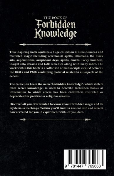 This inspiring book contains a large collection of time-honored and restricted magic. Including ceremonial spells, talismans, the black arts, superstitions, auspicious days, spells, omens, lucky numbers, insight into dreams and folk remedies along with many more. The work within this book is a collection of manuscripts created between the 1800's and 1920s containing material related to all aspects of the occult.The collection bears the name 'forbidden knowledge', which differs from secret knowledge, is used to describe forbidden books or information to which access has been controlled, restricted or deprecated for political or religious reasons.Discover all you ever wanted to know about forbidden magic and its mysterious teachings. Within you'll find its ancient lore and secrets now revealed for you to experiment with - if you dare.