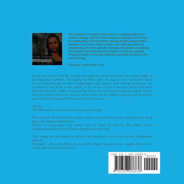 The vision of God and the miraculous works of which he is still applying to our lives today. This book is written and combined with scriptures throughout the Bible for the connecting knowledge of what we all should vision in our lives. What inspires me is the awesome power of God and how he delivers the signs and wonders of how his works through generations of people to survive us from our ancestral connections of Noah, Abraham, Isaac and Jacob. The promise he made to Abraham to never flood the earth again. The most astonishing part of his grace of the movement of the children of Israel who were favored by God to be the people who would be spared for generations. Moses being the chosen one to lead the people to the promise land of milk and honey. Also, what had to happen in the generations in order for us to be a people of generations, cultures, and to teach others the creation of God. To acknowledge God, and knowing who he is helps to share with others the greatness of God. Have faith in God and be blessed.