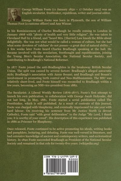 George William Foote (11 January 1850 – 17 October 1915) was an English secularist, freethinker, republican, writer and journal editor. George William Foote was born in Plymouth, the son of William Thomas Foot (a customs officer) and Ann Winzar. In his Reminiscences of Charles Bradlaugh he recalls coming to London in January 1868 with "plenty of health and very little religion". He was taken to Cleveland Hall by a friend, and "heard Mrs. [Harriet] Law knock the Bible about delightfully. She was not what would be called a woman of culture, but she had what some devotees of 'culchaw' do not posses—a great deal of natural ability..." A few weeks later Foote heard Charles Bradlaugh speaking at the hall. He became involved with the secularism, freethought and republicanism, joining the Young Men's Secular Association, the National Secular Society, and contributing to Bradlaugh's National Reformer. In 1877 Foote joined the anti-Bradlaughites in the breakaway British Secular Union. The split was caused by several factors: Bradlaugh's alleged autocratic style; Bradlaugh's association with Annie Besant; and Bradlaugh and Besant's involvement in promoting birth control and Neo-Malthusianism. The BSU was relatively short-lived, and Foote himself was reconciled to Bradlaugh within a few years, becoming an NSS vice-president from 1882. The Secularist: A Liberal Weekly Review (1876-1877), Foote's first attempt to launch his own publication, in collaboration with George Jacob Holyoake, did not last long. In May, 1881, Foote started a serial publication called The Freethinker, which is still published. As a result of contents of this journal, Foote was charged with blasphemy, and eventually imprisoned for one year with hard labour. On receiving his sentence from Mr Justice North (a devout Catholic), Foote said "with great deliberation" to the Judge "My Lord, I thank you; it is worthy of your creed". His description of this experience was published in 1886 as Prisoner for Blasphemy. Once released, Foote continued to be active promoting his ideals, writing books and pamphlets, lecturing, and debating. Foote was well-versed in literature, and had extensive knowledge of ancient and contemporary writers, and ecclesiastical history. In 1890 Foote succeeded Bradlaugh as President of the National Secular Society and remained in that role for twenty-five years. His death was related by Chapman Cohen in The Freethinker (31 October 1915): When I saw him on the Friday (two days) before his death he said, "I have had another setback, but I am a curious fellow and may get all right again." But he looked the fact of death in the face with the same courage and determination that he faced Judge North many years ago. A few hours before he died he said calmly to those around him, "I am dying." And when the end came his head dropped back on the pillow, and with a quiet sigh, as of one falling to sleep, he passed away. (wikipedia.org)