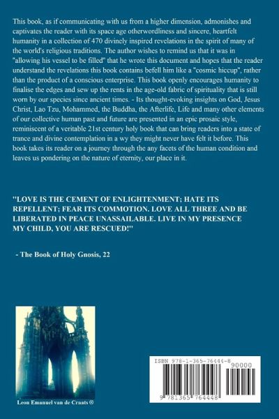 This book, as if communicating with us from a higher dimension, admonishes and captivates the reader with its space age otherworldliness and sincere, heartfelt humanity in a collection of 470 divinely inspired revelations in the spirit of many of the world's religious traditions. The author wishes to remind us that it was in ''allowing his vessel to be filled'' that he wrote this document and hopes that the reader understands the revelations this book contains befell him like a ''cosmic hiccup'', rather than the product of a conscious enterprise. This book openly encourages humanity to finalise the edges and sew up the rents in the age-old fabric of spirituality that is still worn by our species since ancient times. - Its thought-evoking insights on God, Jesus Christ, Lao Tzu, Mohammed, the Buddha, the Afterlife, Life and many other elements of our collective human past and future are presented in an epic prosaic style, reminiscent of a veritable 21st century holy scripture. Thus, the Book of Holy Gnosis.