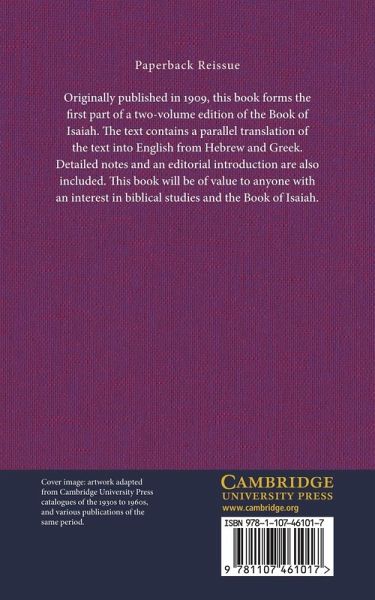 Originally published in 1909, this book forms the first part of a two-volume edition of the Book of Isaiah. The text contains a parallel translation of the text into English from Hebrew and Greek. Detailed notes and an editorial introduction are also included. This book will be of value to anyone with an interest in biblical studies and the Book of Isaiah.
